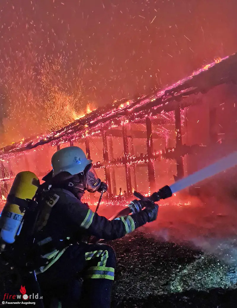 Noch während der Anfahrt erreichte die Integrierte Leitstelle Augsburg sehr viele Notrufe aus dem betroffenen Bereich, die den Brand eines ca. 20 Meter x 5 Meter großen Mülltonnenunterstandes im Vollbrand mit massiver Rauchentwicklung und Funkenflug meldeten. Weitere Notrufe erreichten die Leitstelle mit dem Hinweis das im Seniorenheim, welches sich direkt neben dem Brand befand, bereits mehrere Scheiben gesprungen sind und die Bewohner vom Pflegepersonal in sichere Brandabschnitte innerhalb des Gebäudes evakuiert werden müssen. Das Gebäude wurde hierdurch akut vom Feuer bedroht.
