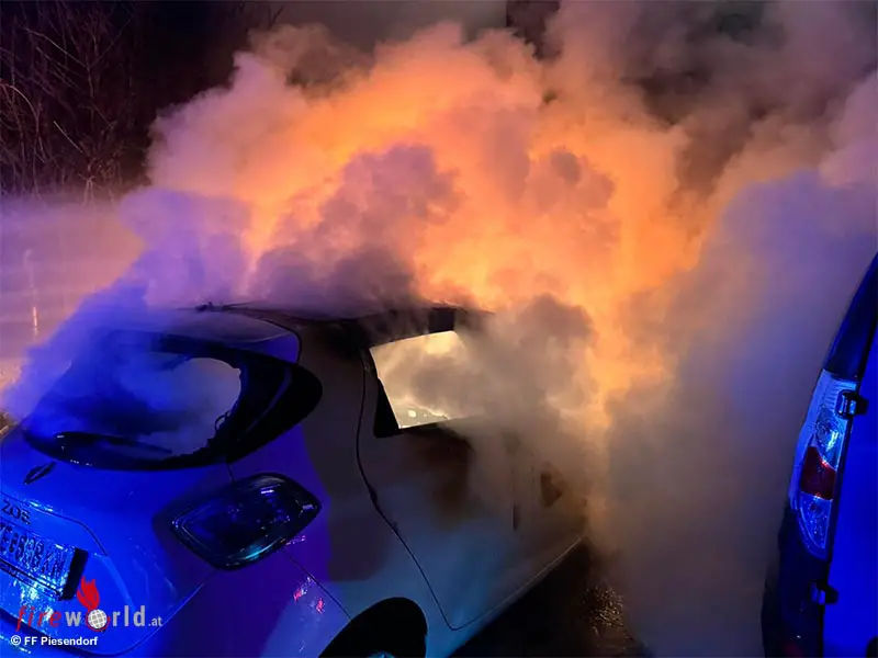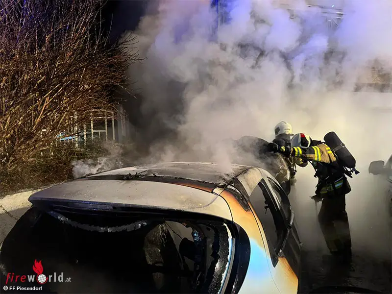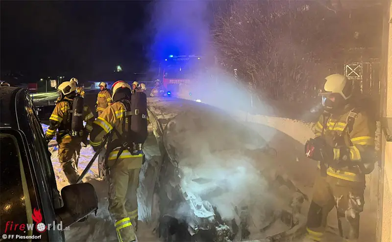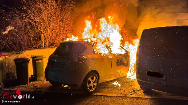 PIESENDORF (SBG): Der stellvertretende Feuerwehrkommandant von Piesendorf, OBI Dürlinger, entdeckte gegen 22.15 Uhr des 11. Dezember 2024 einen Kfz-Brand vor einem Wohnhaus im Imbachhornweg in Piesendorf und verständigte die LAWZ zur Alarmierung.