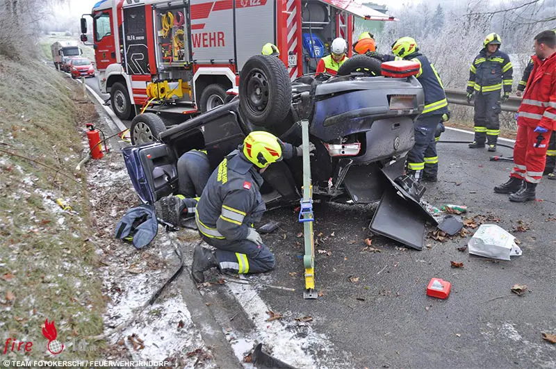 Oö: Pkw landet bei Kremsmünster am Dach → Feuerwehr befreit Lenker