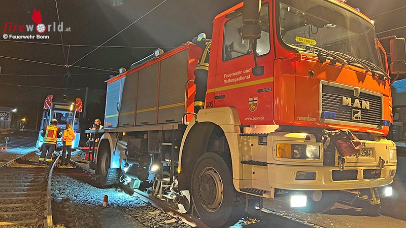 Als die laufenden Einsätze gegen 03:30 Uhr nahezu abgearbeitet waren, wurden die Einsatzkräfte zur Unterstützung der Stadtwerke Bonn zum Betriebshof Beuel gerufen. Hier war eine Bahn mit dem Drehgestell aus den Schienen gesprungen. Die Rüsteinheit konnte die Bahn anheben, verfahren und anschließend wieder auf den Schienen absetzen. Die Maßnahmen waren um 05:10 Uhr beendet.