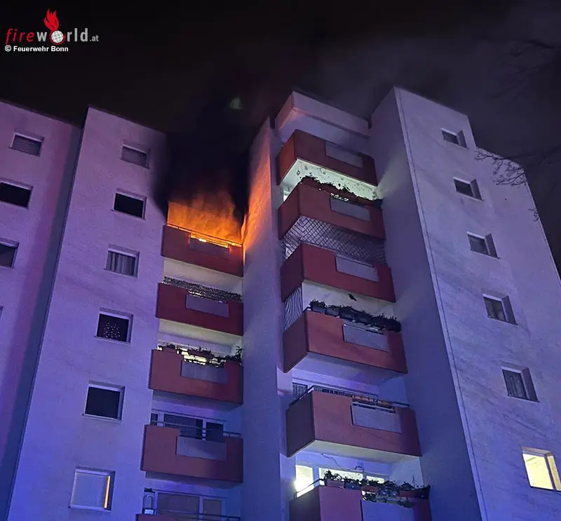 Kurz nach dem Jahresbeginn wurde die Feuerwehr zu einem Brand im Obergeschoss eines Mehrfamilienhauses auf dem Chemnitzer Weg im Ortsteil Tannenbusch gerufen. Die genaue Identifikation der Einsatzstelle stellte sich aufgrund der Vielzahl der Anrufe mit unterschiedlichen Adressen als Herausforderung dar. Bei Eintreffen der ersten Einsatzkräfte schlugen bereits Flammen vom Balkon und aus einer Wohnung im 6.OG und drohten über den Balkon unmittelbar auf das 7. OG überzugreifen.