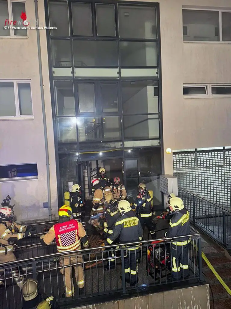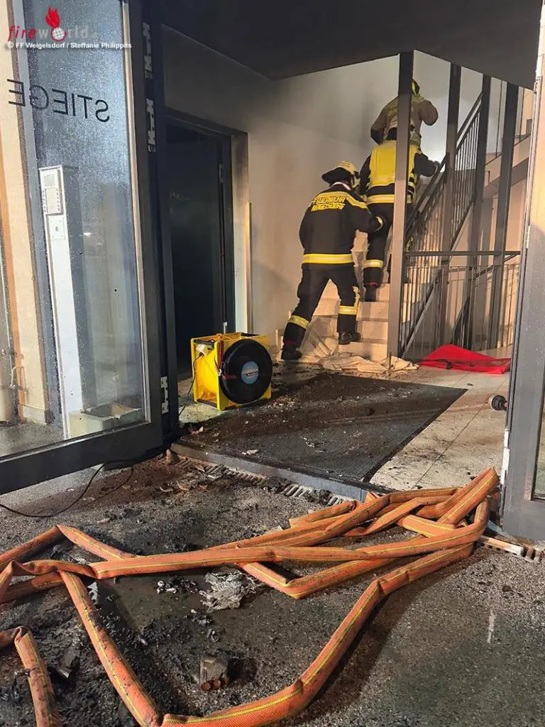 „Als ich die Erkundung beim Müllraum durchführte drang mir bereits dichter Rauch und eine enorme Strahlungshitze vom Feuer entgegen“, so Feuerwehreinsatzleiter Rene Weiner von der FF Weigelsdorf. Bei der Türe zum Müllraum ließ er einen Rauchvorhang setzen, um den Brandrauch ins direkt angrenzende Stiegenhaus abzuwehren. Mittels Innenangriff unter Atemschutz wurde die Brandbekämpfung im Müllraum aufgenommen. Nachrückende Kräfte unterstützten die Löscharbeiten. Mehrere Müllbehälter wurden ein Raub der Flammen. Mittels Hochleistungslüfter wurde das Stiegenhaus druckbelüftet und alle betroffenen Räumlichkeiten entraucht.