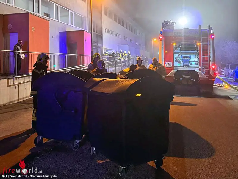 Jedoch ein Einsatz um 00:50 Uhr in Weigelsdorf (Gemeinde Ebreichsdorf) beschäftige zwei alarmierte Feuerwehren länger. Nach ersten Informationen brach durch Feuerwerkskörper in einem Müllraum einer Wohnhausanlage ein Brand aus.