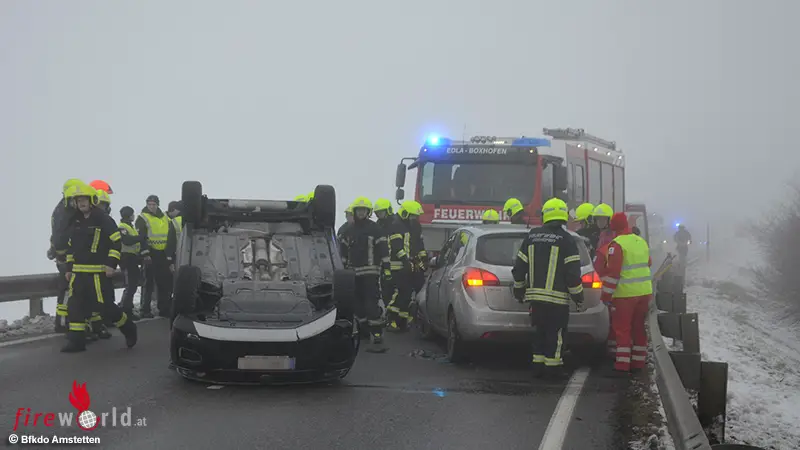 Ein Pkw kam von der Fahrbahn ab, überschlug sich und kollidierte anschließend mit dem Gegenverkehr. Die Personen konnten von den Einsatzkräften rasch aus den Fahrzeugen gerettet und anschließend dem Rettungsdienst übergebenwerden.