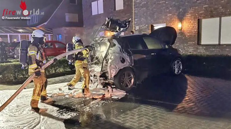 VREDEN (DEUTSCHLAND): Am 8. Jänner 2025 um 01:56 Uhr wurde eine Gruppe des Löschzuges Vreden mit dem Stichwort „Fahrzeugbrand“ zu einem Mehrfamilienhaus auf die Kerssenbrockstraße alarmiert. Bei Eintreffen der Feuerwehr brannte ein Pkw vor dem Gebäude.
