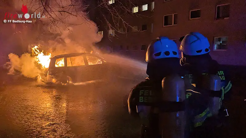 BEDBURG-HAUU (DEUTSCHLAND): Die Freiwillige Feuerwehr Bedburg-Hau wurde um 00:41 Uhr des 14. Jänner 2025 zu einem Fahrzeugbrand an einem Mehrfamilienhaus an der Saalstraße alarmiert. Ein hinter dem Haus abgestellter VW Touran war in Brand geraten.