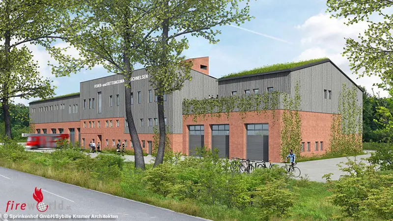 Auf dem ca. 6.000 m² großen Grundstück am Schleswiger Damm steht nun der fertige Rohbau des überwiegend dreigeschossigen Gebäudekomplexes mit einem hochmodernen Übungsturm über sechs Ebenen, der mit einer Höhe von 22 Metern im rückwärtigen Bereich als Landmarke aufragt. Hier werden Einsatzkräfte der Berufsfeuerwehr und sowie der Freiwilligen Feuerwehr gemeinsam trainieren. Die Gliederung garantiert kurze Wege und optimiert interne Abläufe: In einem Teil die Feuerwache, im zweiten Teil der Rettungsdienst und im mittleren Teil die Administration mit Appellhalle. Ruheräume und Lagerbereiche befinden sich im Zwischengeschoss, Gemeinschaftsflächen wie Aufenthalts- und Sporträume im Obergeschoss. Die rund 210 Einsatzkräfte erhalten damit einen hochmodernen und vollumfänglich ausgestatteten Neubau.