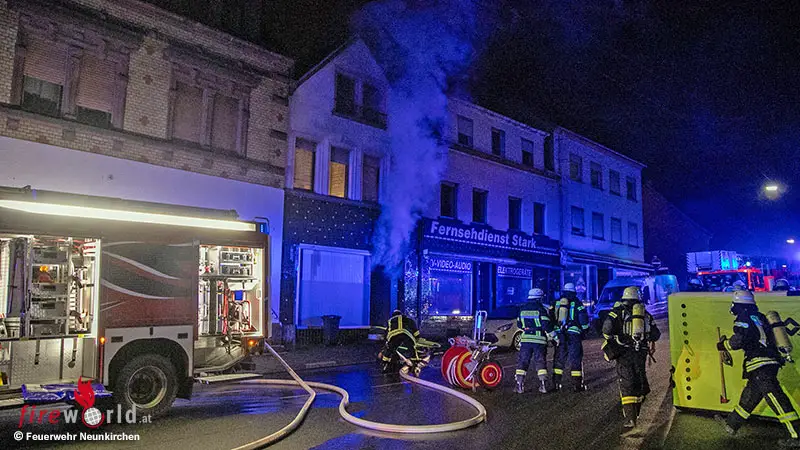 D: Wohnhausbrand in Neunkirchen → Feuerwehr rettet Menschen mit Sprungpolster und Drehleiter