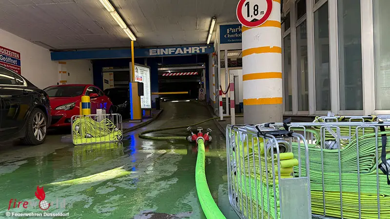 D: Feuer in einer Großgarage in der Innenstadt von Düsseldorf → 3 Pkw zerstört, 17 durch Rauch beaufschlagt