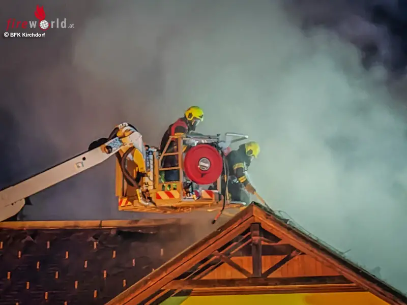 Die Intensität des Brandes erhöhte sich, mittels der Teleskopmast Bühne der FF Spital und der Drehleiter Kirchdorf wurden zwei DRILL-X (Bohrlöschgeräte) in Stellung gebracht, um nicht zugängliche Dachbodenabschnitte zu löschen.