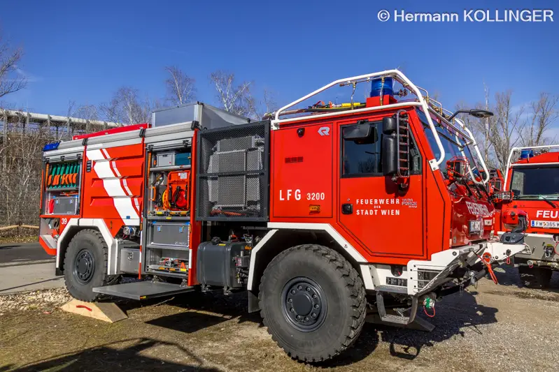 Mit zusätzlichen Düsen am Fahrerhaus kann über die komplette Fahrzeugfront ein Wasservorhang zum Schutz der Kabine erzeugt werden. Andreas Zeller, Vertriebsvorstand der Rosenbauer International AG dazu: „Der Klimawandel lässt auch in Österreich die Gefahr von Vegetationsbränden kontinuierlich steigen. Das hat uns nicht zuletzt der Waldbrand auf der Rax vor drei Jahren eindrücklich gezeigt. Mit dem Kauf der neuen Katastrophenschutzfahrzeuge stellt die Berufsfeuerwehr Wien, die auch für den Wienerwald zuständig ist, ihre vorausschauende Planung unter Beweis. Ich freue mich, dass dabei die Wahl auf die MT-Reihe von Rosenbauer gefallen ist“