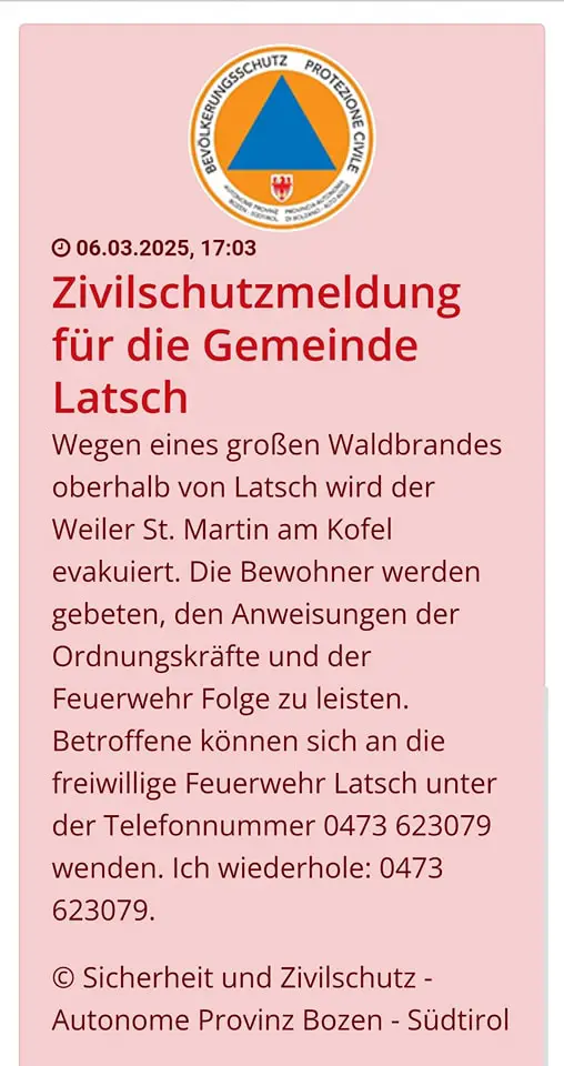 LATSCH (SÜDTIROL | ITALIEN): Der Landes-Feuerwehrverband Südtirol berichtet am Nachhmittag des 6. März 2025 über einen größeren Waldbrand, nach dessen Ausbruch in der Nähe Bergfraktion St. Martin im Kofel in der Gemeinde Latsch alle Einsatzkräfte voll im Einsatz stehen.