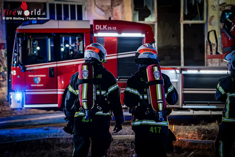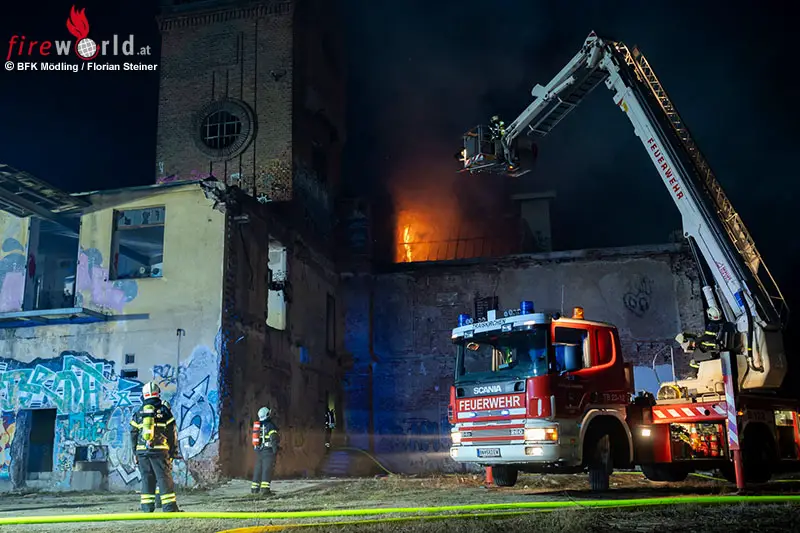 Der Einsatzleiter der Freiwilligen Feuerwehr Gumpoldskirchen, Christian Fröhlich, berichtete von einem Feuerschein auf einem der Türme, der schon bei der Anfahrt sichtbar war. Umgehend forderte er zusätzlich zur Feuerwehr Guntramsdorf die Drehleiter und eine weitere Löschgruppe aus Wiener Neudorf an. Laut Polizei war zu diesem Zeitpunkt nicht klar, ob sich noch Personen in dem baufälligen Fabriksgebäude befinden.