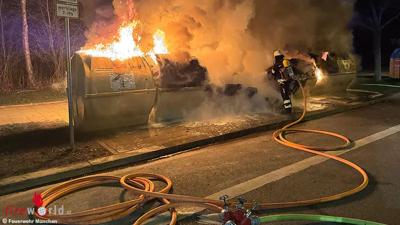 MÜNCHEN (BAYERN): In der Nacht auf Donnerstag, 3. April 2025, ist die Feuerwehr München zu mehreren in Flammen stehenden Recyclingcontainern ausgerückt. Verletzt wurde dabei niemand.