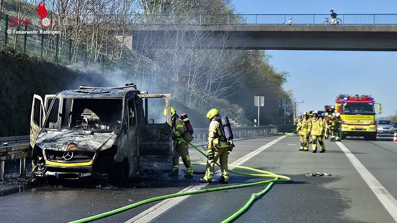 Die dichten Rauchschwaden, die von der Autobahn aufstiegen, waren von der Innenstadt bereits sichtbar. Die Feuerwehr Ratingen, die über das Dreieck Ratingen Ost für Einsatzfahrzeuge sehr schnell die Einsatzstelle erreichen konnte, traf einen auf der Standspur stehenden Abschleppwagen des Typs Mercedes-Sprinter an, der in voller Ausdehnung brannte. Die intensive Hitze des Feuers war selbst aus einiger Entfernung spürbar was teile der Böschung entzündete. Der Fahrer des Fahrzeuges war leicht verletzt und wurde durch den Rettungsdienst Ratingen und Heiligenhaus versorgt.