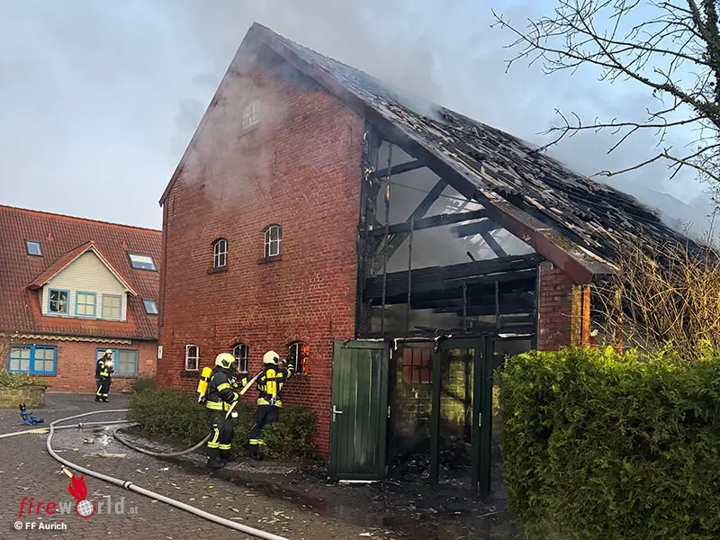 AURICH (DEUTSCHLAND): Auf dem Gelände einer Seniorenwohnanlage in der Bürgermeister-Friesenborg-Straße stand am Freitagmorgen, 4. April 2025, ein größeres Nebengebäude in Flammen. Das Feuer hatte sich bei Ankunft der ersten Einsatzkräfte bereits auf den kompletten Bau ausgebreitet.