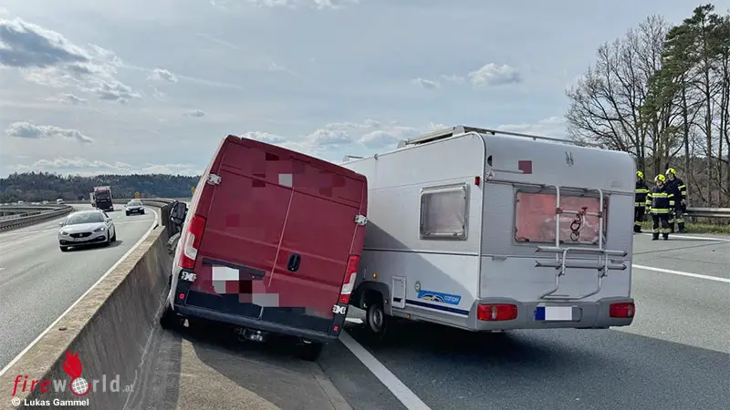 Vor Ort wurde ein Kleinbus vorgefunden, wo zwei Personen eingeschlossen waren. Durch die Mittelleitwand auf der einen und durch einen Wohnwagenanhänger auf der anderen Seite wurde die Tür blockiert. Mit der Seilwinde des HLF1 wurde der verkeilte Wohnwagenanhänger soweit entfernt, dass die Personen aussteigen konnten.