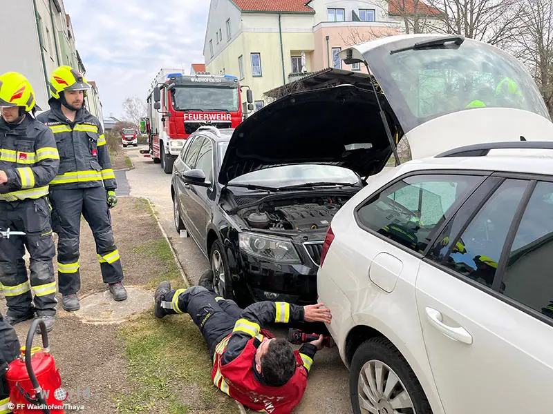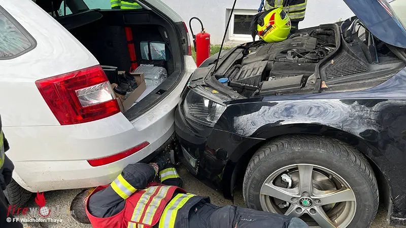 Ein am Parkplatz abgestellter Lieferwagen kam aus bislang unbekannter Ursache selbständig ins Rollen und krachte mit dem Heck in die Seitentür eines ebenfalls dort parkenden schwarzen Skoda Octavia. Durch die Wucht des Aufpralles wurde der Skoda gegen den vor ihm parkenden weißen Skoda Octavia geschoben. Dadurch bohrte sich die Anhängevorrichtung des vorderen Wagens in den Frontbereich des schwarzen Skoda. Erste Versuche durch die Fahrzeugbesitzer, die beiden Fahrzeuge auseinanderzuziehen schlugen fehl. Daher wurde die Feuerwehr Waidhofen/Thaya zur Unterstützung gerufen.