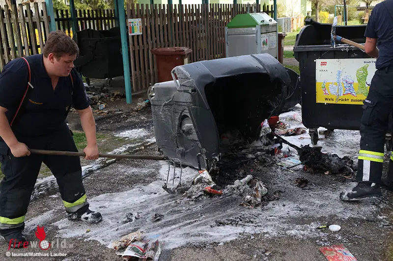 Vor Ort gab ein 49-jähriger Hausbewohner an, dass er den Brand bereits gelöscht hat und mehrere Jugendliche beim Davonlaufen sah. Kurz darauf wurde in der Lärchenstraße (in der Nähe) ein Müllcontainer in Brand gesetzt und zeitgleich brannten auch in der Eibenstraße 72 drei weitere Müllcontainer. Durch den Vorfall wurden keine Personen verletzt und die Brände wurden gelöscht. Eine Schadenssumme ist derzeit nicht bekannt. Durch Zeugenaussagen konnten die mündigen Minderjährigen ausgeforscht werden. Bei den beiden Haupttätern handelt es sich um 13-jährige Burschen aus Wels.