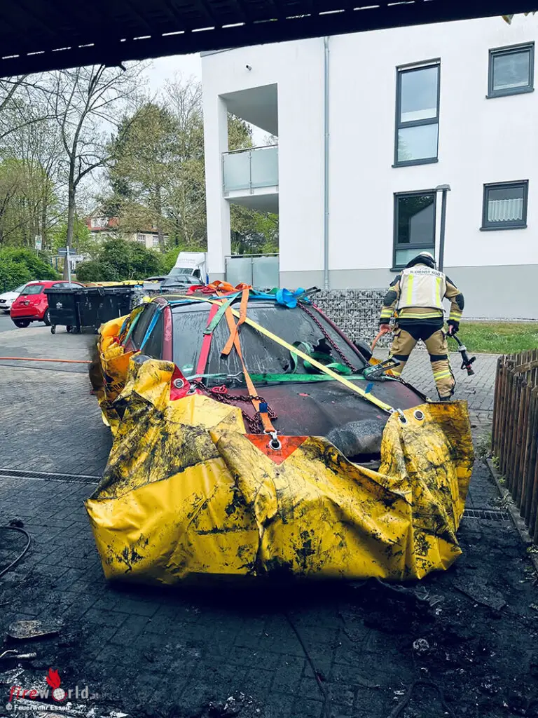 D: In Garage brennendes Elektroauto in Löschwindel gepackt