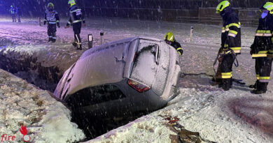 GROSSAU (NÖ): Zu einem spektakulären Verkehrsunfall kam es am 17. April 2025 im Wohngebiet von Großau, einem Ortsteil der Gemeinde Bad Vöslau. Warum es zu dem Unfall kam ist nicht bekannt, jedoch nachdem der Kleinwagen gegen ein geparktes Fahrzeug geprallt war, wurde der Unfallwagen regelrecht ausgehoben und stürzte seitlich um. Dabei erlitt der Lenker Verletzungen unbestimmten Grades und wurde im Fahrzeug eingeschlossen.