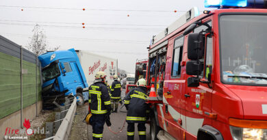 KUNDL (TIROL): Am 23. April 2025 gegen 07:55 Uhr fuhr ein 31-jähriger Georgier mit einem Sattelkraftfahrzeug auf der A12 Inntalautobahn im Gemeindegebiet von Kundl von Italien kommend in Richtung Kufstein. Kurz vor der Autobahnausfahrt „Wörgl West” brach im Bereich des linken Reifens an der zweiten Achse des Sattelanhängers ein Feuer aus.