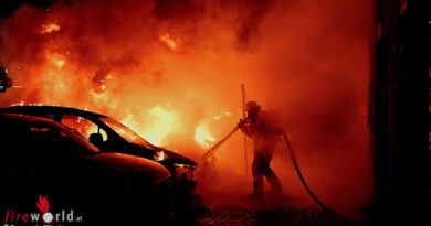 Auf Grund der zahlreichen Anrufe und der Meldungen vor Ort erhöhte der Einsatzleiter noch auf Anfahrt das Alarmstichwort auf Feuer mit zwei Löschzügen und Menschenleben in Gefahr (FEU2Y). Als die ersten Einsatzkräfte an der Einsatzstelle ankamen, brannte der Dachbereich der zweigeschossigen Wohnunterkunft bereits an mehreren Stellen mit deutlich sichtbarem Flammenbild. In der Unterkunft, welche in Containerbauweise errichtet wurde, wurden zu diesem Zeitpunkt noch weitere Personen vermutet. Nach einer Sichtung der Bewohnerinnen und Bewohner durch den ersteintreffenden Notarzt konnte dies jedoch nicht bestätigt werden.