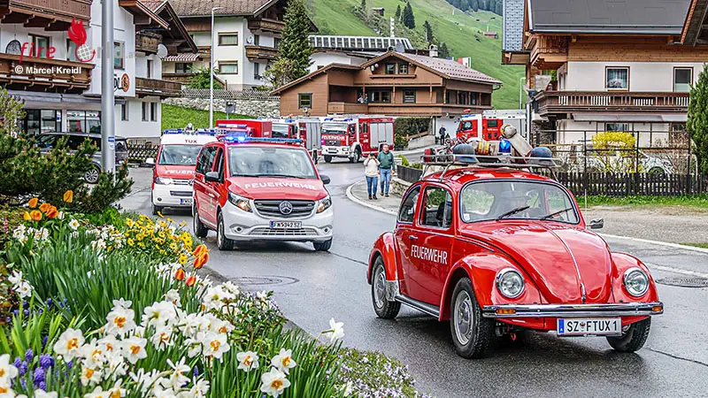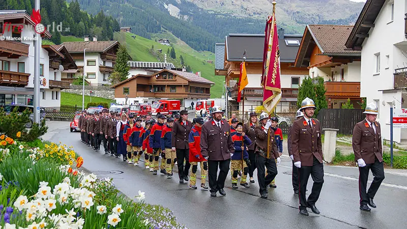 Anschließend marschierten alle gemeinsam zur Pfarrkirche, begleitet von den Klängen der Bundesmusikkapelle Tux, die den Festumzug anführte. Gefolgt wurden sie von Kommandant Benjamin Stöckl und seinem Stellvertreter Christian Klausner, die den Gesamtzug der Feuerwehr anführten. Am Kirchplatz angekommen, wurden die Fahrzeuge der Wehr beim Vorüberfahren gesegnet.