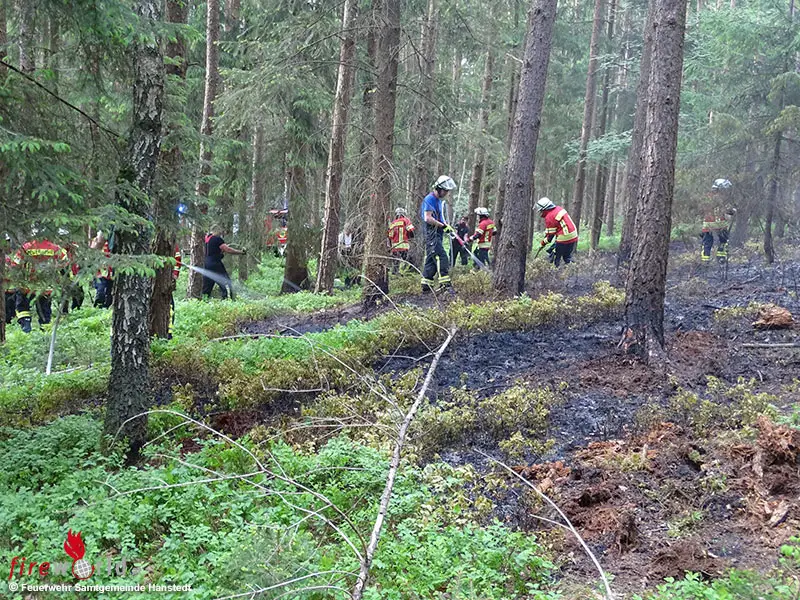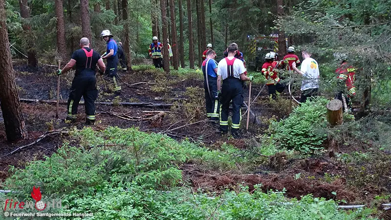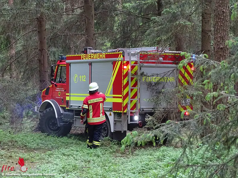 HANSTEDT (DEUTSCHLAND): Wanderer entdeckten am Mittwochabend, 14. Mai 2025, zwischen der Ortschaft Dierkshausen und der Töpsheide, in einem ausgedehnten Nadelbaumwaldstück, brennendes Unterholz. Sie alarmierten umgehend die Feuerwehr. Von der Leitstelle des Landkreises Harburg wurden die Freiwilligen Feuerwehren aus Dierkshausen, Brackel und Hanstedt alarmiert.