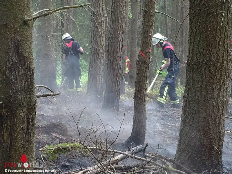 Die Arbeit der Einsatzkräfte zeigte schnell Wirkung, so konnte der Brand auf eine Fläche von etwa 700 Quadratmeter begrenzt werden. Für die Nachlöscharbeiten musste der Untergrund des betroffenen Brandbereichs mit Hacken und Schaufeln geöffnet werden und anschließend mit fünf Strahlrohren abgelöscht werden. Das Löschwasser wurde mit Netzmittel versetzt, um auch in den tieferen Bodenschichten einen Löscherfolg zu erzielen.