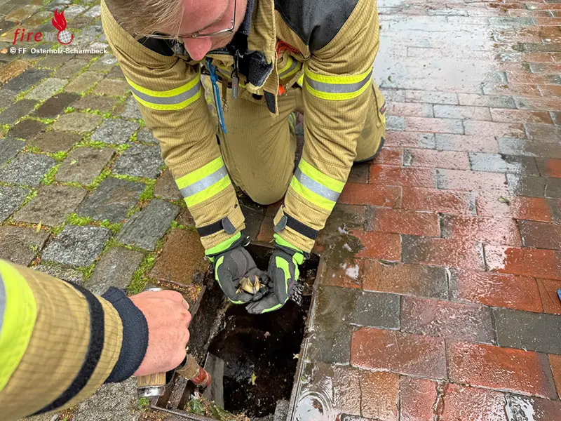 OSTERHOLZ-SCHARMBECK (DEUTSCHLAND): Drei Entenküken sorgten am Sonntagvormittag, 25. Mai 2025, für einen fast zweistündigen Einsatz der Feuerwehr Osterholz-Scharmbeck.