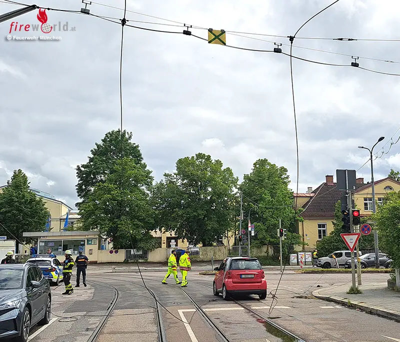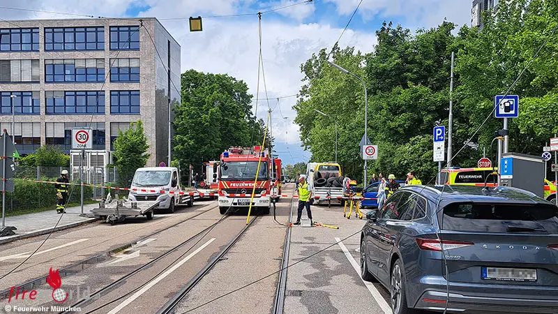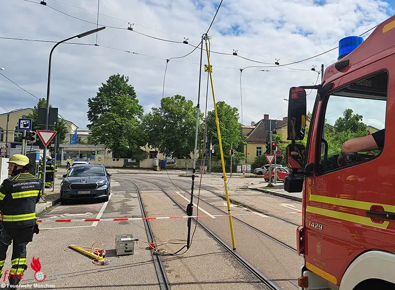 Am Montagnachmittag wurden Einsatzkräfte der Feuerwehr München zu einem Stromunfall alarmiert. In der Aschauer Straße hatte ein Lkw die Fahrdrähte der Tram berührt und diese zu Boden gerissen. Die Fahrdrähte stürzten auf die Fahrbahn und beschädigten mehrere Pkw. Zwei Personen konnten ihr Fahrzeug nicht mehr verlassen, da die Stromleitungen auf dem Auto zum Liegen gekommen waren.