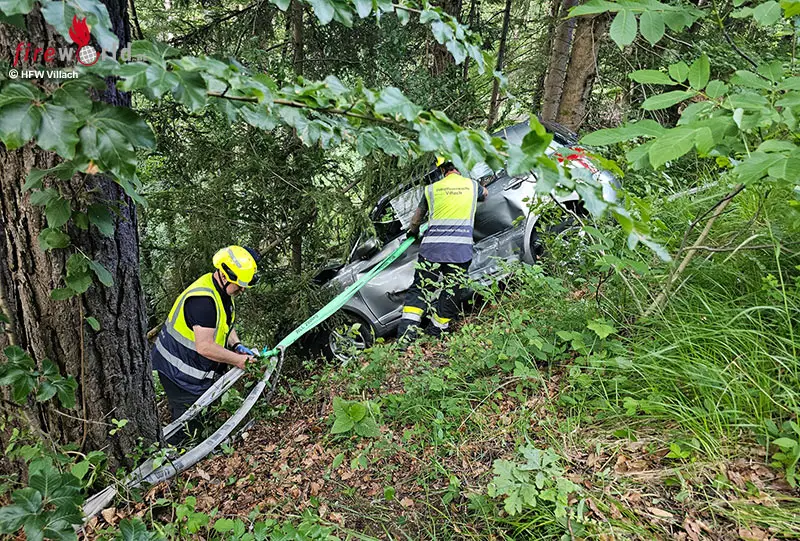 Kurz vor 19:00 Uhr wurde erneut Alarm durch die Feuerwehrleitstelle Villach ausgelöst. Ein Fahrzeugabsturz nach einem Verkehrsunfall auf der Villacher Alpenstraße wurde gemeldet. Die Hauptfeuerwache Villach rückte gemeinsam mit der FF Judendorf sowie der örtlich zuständigen FF Möltschach unverzüglich aus. Vor Ort bot sich folgendes Bild: Zwei Pkw waren kurz vor der Mautstelle aus noch unbekannter Ursache miteinander kollidiert, ein Fahrzeug kam dadurch von der Fahrbahn ab und stürzte rund sechs Meter über die steile Straßenböschung, so Hauptbrandmeister Scharf Alexander, Zugskommandant der Hauptfeuerwache Villach.