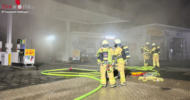 Der diensthabende Disponent alarmiert die im Haus befindliche Nachtbereitschaft, welche kurz darauf mit einem Tanklöschfahrzeug ausrückte. Beim Eintreffen des ersten Fahrzeuges stellte der Fahrzeugkommandant fest, dass ein Anhänger in Vollbrand stand. Dieser hatte zwei Klein-Lkw bereits ebenfalls entfacht. Die Fahrzeuge standen auf dem Gelände einer Tankstelle in unmittelbarer Nähe der Werkstattboxen.