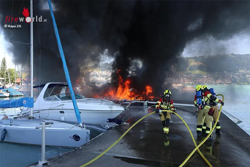 Gegen 14:30 Uhr ist auf einem Boot im Hafen Zug ein Feuer ausgebrochen. Der Brand weitete sich sehr schnell auf drei weitere Boote aus. Durch die Freiwillige Feuerwehr der Stadt Zug, die sehr rasch mit ersten Einsatzkräften vor Ort war, konnte der Brand unter Kontrolle gebracht und ein Übergreifen auf weitere Boote verhindert werden. Bei den fünf betroffenen Booten handelt es sich um drei Segelboote sowie zwei Motorboote. Davon sind zwei, ein Motorboot und ein Segelboot, gesunken. Gemäß den bisherigen Ermittlungen ist das Feuer auf einem Motorboot ausgebrochen.