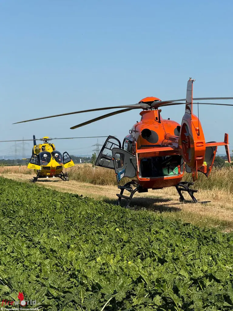 GREVENBROICH (DEUTSCHLAND): Bei einem schweren Verkehrsunfall zwischen einem Pkw und einem Kleintransporter auf der Landstraße zwischen Neurath und Oekoven sind am Montagnachmittag, 30. Juni 2025, vier Insassen teils lebensgefährlich verletzt worden. Nachdem die Feuerwehr zwei in ihren Fahrzeugen eingeschlossenen Unfallopfer aus den Wracks befreit hatte, wurden diese aufgrund der Schwere der Verletzungen mit Rettungshubschraubern in Unfallkliniken geflogen.
