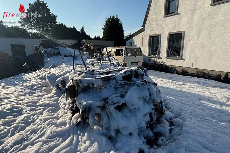 GOCH (DEUTSCHLAND): Gegen 03:40 Uhr ist am 4. Juli 2025 ein Feuer an oder in einem Reisemobil in Pfalzdorf in Goch ausgebrochen. Das Fahrzeug stand auf einer Hofeinfahrt zwischen zwei Wohnhäusern, ein weiteres Fahrzeug war ebenfalls auf der Einfahrt geparkt.