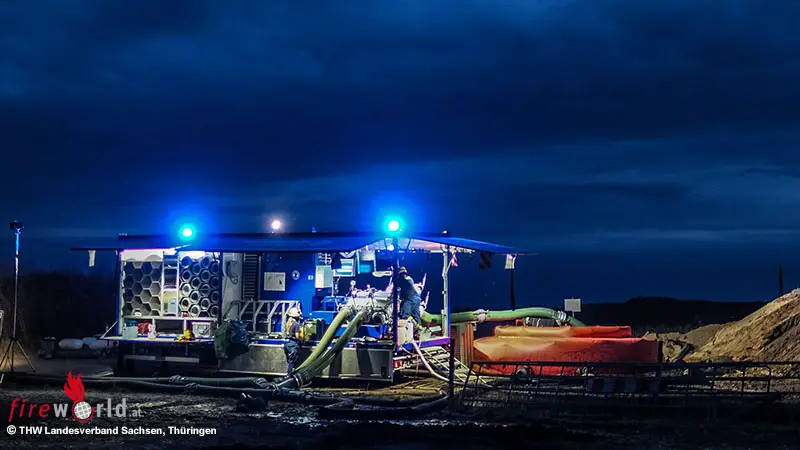Die THW-Großpumpen, von denen es aktuell zehn Stück im gesamten Bundesgebiet gibt, haben eine Förderleistung von bis zu 25.000 Liter pro Minute. Im Landesverband Sachsen, Thüringen gibt es zwei dieser Großpumpen. Seit 2018 ist eine davon im Ortsverband Riesa stationiert (im Einsatz in der Gohrischheide, siehe Bilder), die zweite im Ortsverband Apolda.
