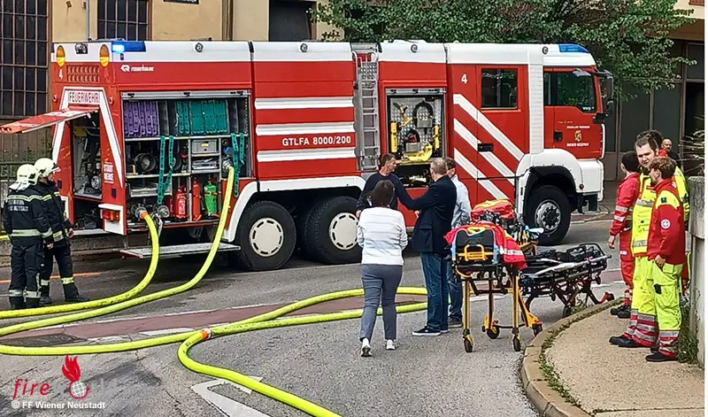 WIENER NEUSTADT (NÖ): Beim Abmischen zweier Chemikalien zur Herstellung eines Bindemittels für Gussformen kam es in Wiener Neustadt am 11. Juli 2025 zu einer Reaktion mit Hitzeentwicklung, einer sogenannten exothermen Reaktion. In weiterer Folge schmolzen die Behälter und es trat ein beißender Geruch sowie eine Rauchwolke, vom beginnenden Brand der Behälter, auf. Die Feuerwehr Wiener Neustadt – zunächst auf einen Brand eingestellt, aber rechtzeitig vor dem Ausrücken noch über den wahren Einsatzgrund informiert – rückte innerhalb weniger Minuten zu einem Schadstoffeinsatz mit den dafür korrekten Fahrzeugen aus.