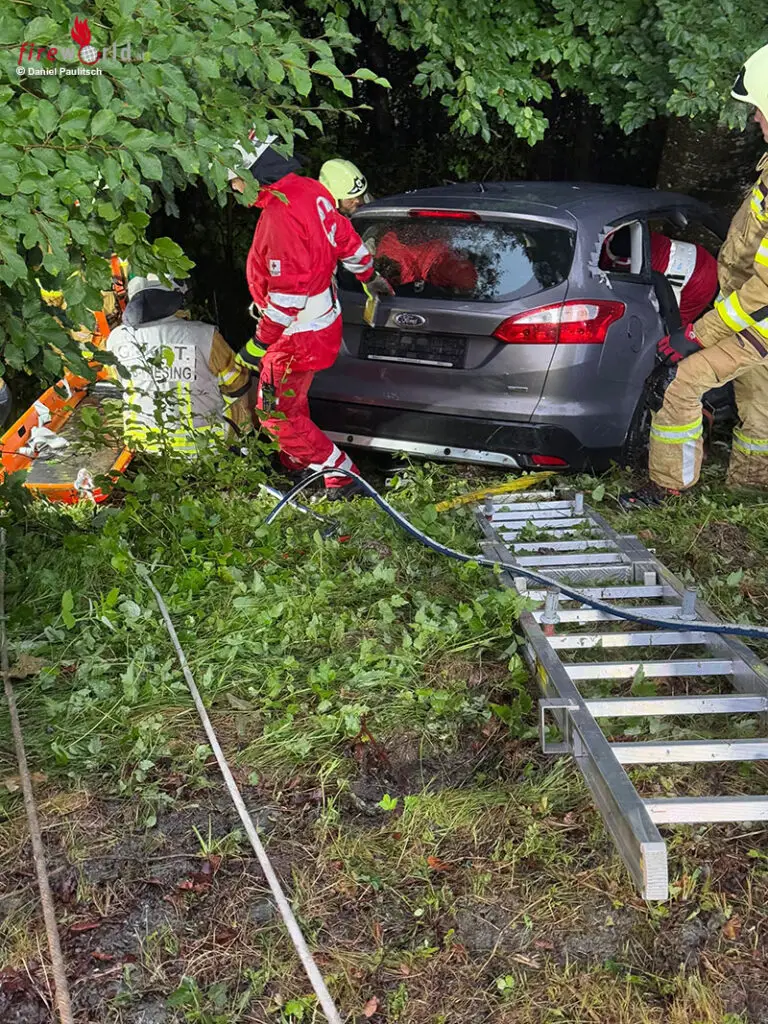 Das Übungsszenario hatte es in sich: Ein Pkw war von der Fahrbahn abgekommen und einen steilen Abhang hinuntergestürzt. Drei Personen galten als betroffen – zwei davon waren im Fahrzeug eingeklemmt. Erschwert wurde die Rettung durch die steile Hanglage und starken Dauerregen, der die Bedingungen zusätzlich verschärfte.