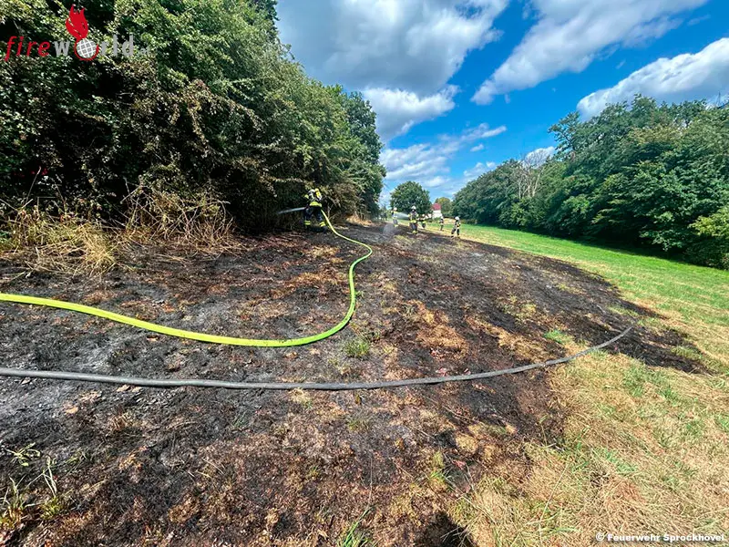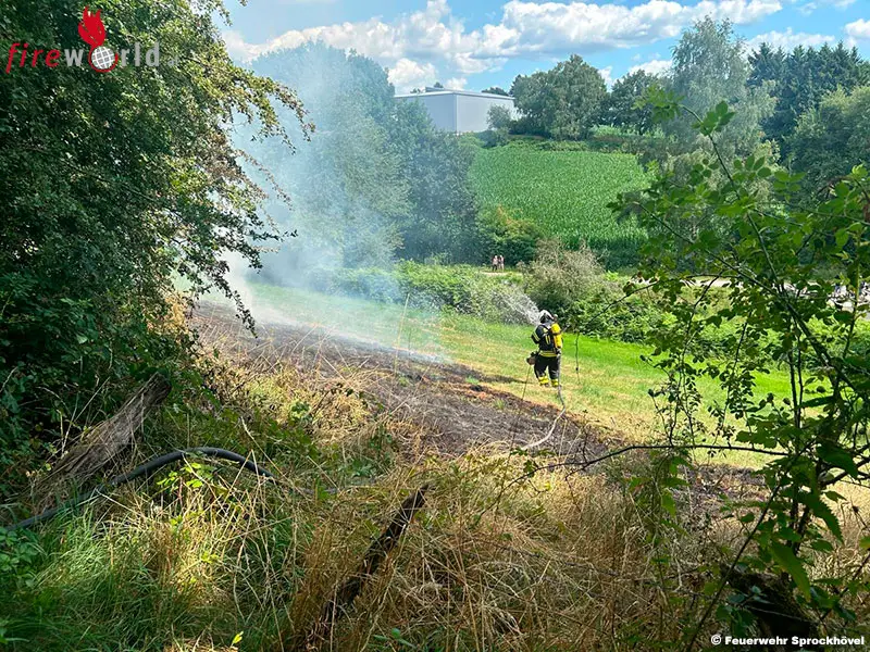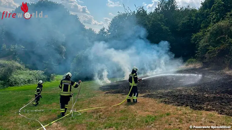 SPROCKHÖVEL (D): Am Dienstag, den 15. Juli 2025, wurde die Feuerwehr Sprockhövel gegen 15.30 Uhr zu einem Brand auf einer Wiese im Bereich der Straße Wiggers gerufen. Dort brannte auf einer Fläche von ca. 400 Quadratmeter eine Wiesenfläche. Der Brand drohte auf eine angrenzende Waldfläche über zu springen.