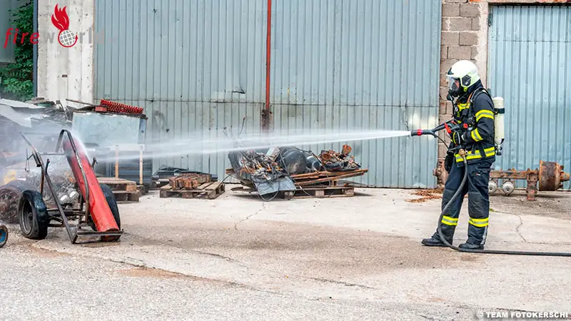 PETTENBACH (OÖ): Beim Eintreffen der Feuerwehr war der Brand bereits gelöscht worden. Die Hauptaufgabe der Einsatzkräfte bestand daher in umfassenden Kühlmaßnahmen. Zwei betroffene Gasflaschen wurden zunächst im Inneren des Gebäudes mit Wasser gekühlt.