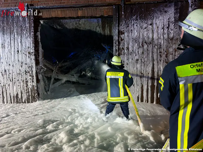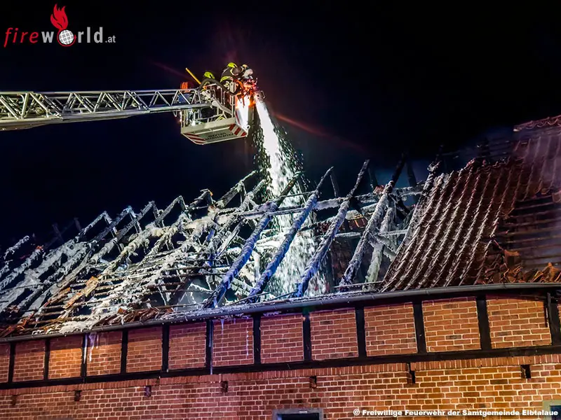 Vor Ort bot sich den Einsatzkräften ein dramatisches Bild: Ein Scheunengebäude stand bereits in Flammen. Noch während der Anfahrt wurde eine vermisste Person gemeldet, die glücklicherweise wenig später unversehrt aufgefunden werden konnte. Die Einsatzleitung bildete sechs Einsatzabschnitte, um das Feuer gezielt zu bekämpfen. Zur Unterstützung wurden die Drehleitern aus Dannenberg und Uelzen angefordert. Beide Fahrzeuge kamen im Verlauf des Einsatzes auch zum Einsatz, um unter anderem Teile des Daches zu öffnen und Brandnester im Giebelbereich gezielt abzulöschen.