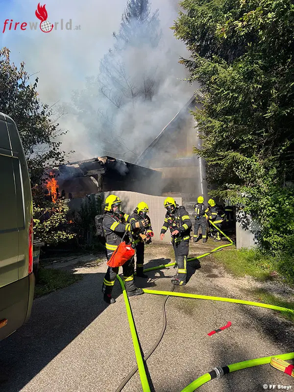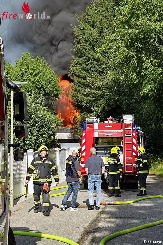 STEYR (OÖ): Am Freitag, den 18. Juli 2025, wurde die Freiwillige Feuerwehr Steyr um 17.13 Uhr mit dem Alarmstichwort „Brand Gebäude – vermutlich nach Explosion“ in den Stadtteil Waldrandsiedlung, Bereich Münichholz-Stadtbad, gerufen. Beim Eintreffen der ersten Kräfte wurde erkannt das ein Garagenkomplex in Vollbrand stand. Gewaltige Flammen schlugen aus dem Bauwerk. Das Feuer hatte sich bereits auf angrenzendes Objekte sowie Teile eines nahen Waldstücks ausgebreitet.