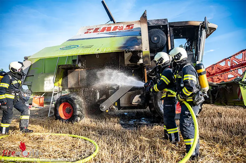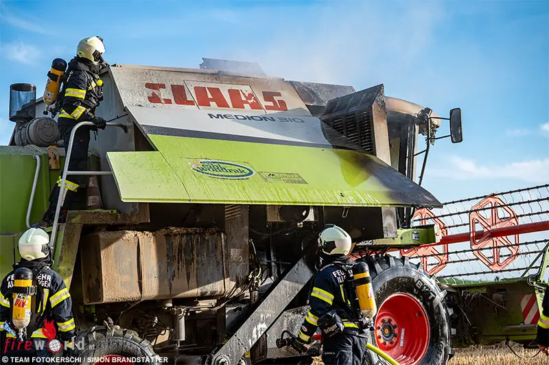 Der Mähdrescher brannte jedoch vollständig aus. Die Feuerwehren Allerheiligen-Lebing und Perg standen im Einsatz. Unter schwerem Atemschutz wurden die Löscharbeiten durchgeführt. Mithilfe einer Wärmebildkamera kontrollierten die Einsatzkräfte das ausgebrannte Fahrzeug auf etwaige Glutnester, die anschließend gezielt abgelöscht wurden.