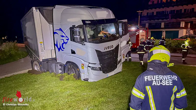 UNTERACH (OÖ): Am 21. Juli 2025 wurde die Feuerwehr Au-See um 22:20 Uhr zu einer Bergung eines Lkw alarmiert. Ein Sattelzug war in der Ortschaft Ort am Mondsee in einer leichten Kurve gerade ausgefahren und in einer abfallenden Wiese eingesunken und mit der Zugmaschine stecken geblieben.