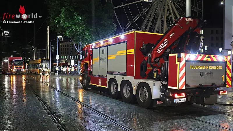 DRESDEN (DEUTSCHLAND): Gegen 23.15 Uhr kam es am 24. Juli 2025 am Postplatz in Dresden zu einer Entgleisung einer Straßenbahn infolge eines Weichenfehlers. Die Feuerwehr Dresden wurde zur technischen Hilfeleistung alarmiert.