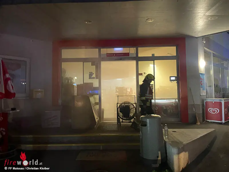 Zeitgleich traf die Polizei ein und klärte die Situation: Es handelte sich um einen Einbruchsversuch, bei dem durch die Alarmanlage ein Rauchsprengsatz ausgelöst wurde. Dieser führte zur kompletten Verrauchung des Geschäftsgebäudes. Die Polizei durchsuchte das Gebäude gründlich, konnte jedoch keine Personen mehr im Inneren vorfinden. Daraufhin wurden alle nachalarmierten Feuerwehren storniert. Die FF Maissau setzte den Druckbelüfter ein, um das Gebäude rauchfrei zu machen, sodass der Geschäftsbetrieb am nächsten Tag ohne Schäden wieder aufgenommen werden konnte.