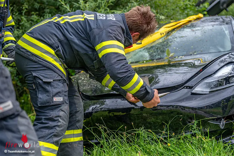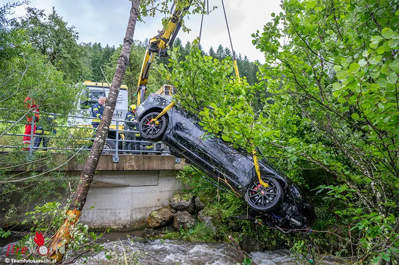 HINTERSTODER (OÖ): Am Vormittag des 29. Juli 2025 wurde die Feuerwehr Hinterstoder zu einem Verkehrsunfall auf der Vorderstoderlandestraße L551 alarmiert. Ein Elektrofahrzeug war von der Fahrbahn abgekommen, durchbrach eine Weide und kam schließlich im Bachbett des Loigis zum Stillstand.