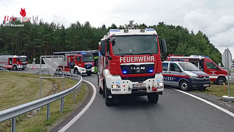 Die Stadtfeuerwehr Pinkafeld rückte mit einem ELF (Einsatzleitfahrzeug), einem SRF (schweres Rüstfahrzeug), einem RLF (Rüstlöschfahrzeug), einem WLF (Wechselladefahrzeug) und 20 Mann zum Einsatz auf die A2 aus.